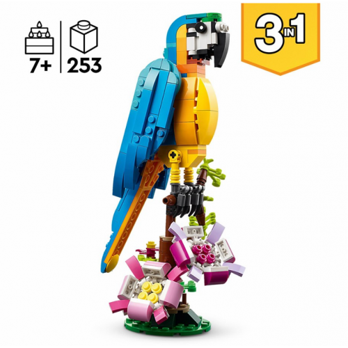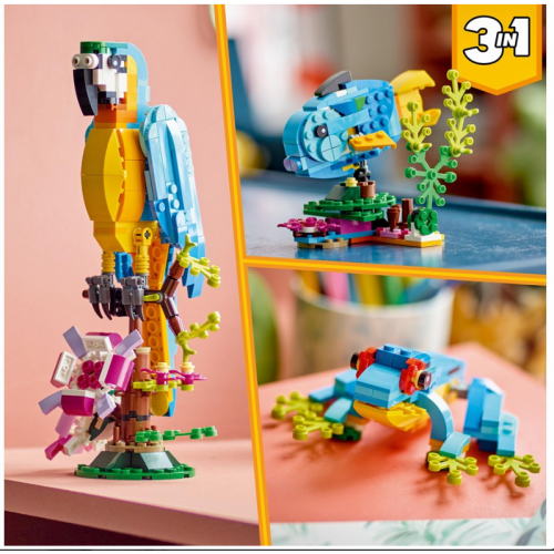 Inne i esken vil du oppdage tre eksotiske skapninger i form av en papegøye, fisk og frosk, som tilbyr uendelige muligheter for kreativ historiefortelling og eventyr i naturen. Hvert dyr har bevegelige deler for ekstra realisme og spenning. Med 253 elementer kan barn fra 7 år og oppover nyte en tilfredsstillende byggeopplevelse samtidig som de forbedrer sin behendighet og problemløsningsferdigheter.